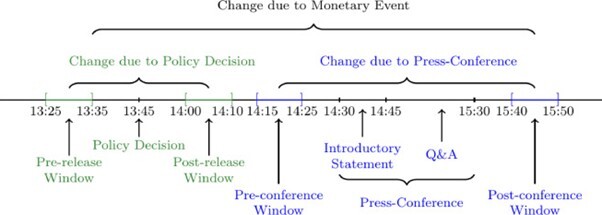 Schließlich zeigt Abbildung (d) einen Tag, an dem es weder im Zeitraum der Pressemitteilung noch in der Pressekonferenz zu Überraschungen kommt. Solche geldpolitischen Entscheidungstage sind überraschend selten – meist gibt es zumindest einige Neuigkeiten für die Finanzmärkte, insbesondere während der Pressekonferenz.