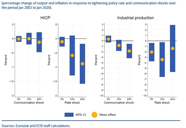 Die Grafik zeigt die Reaktionen der Industrieproduktion und des Harmonisierten Verbraucherpreisindex (HICP) sowohl auf Zinserhöhungs- als auch auf Kommunikationsschocks. Dabei zeigt sich, dass die Inflation weniger durch eine überraschende Kommunikation beeinflusst werden kann, sondern stärker durch eine tatsächliche Straffung der Geldpolitik. Bei der Industrieproduktion ist der Einfluss der Kommunikation dagegen stärker messbar.