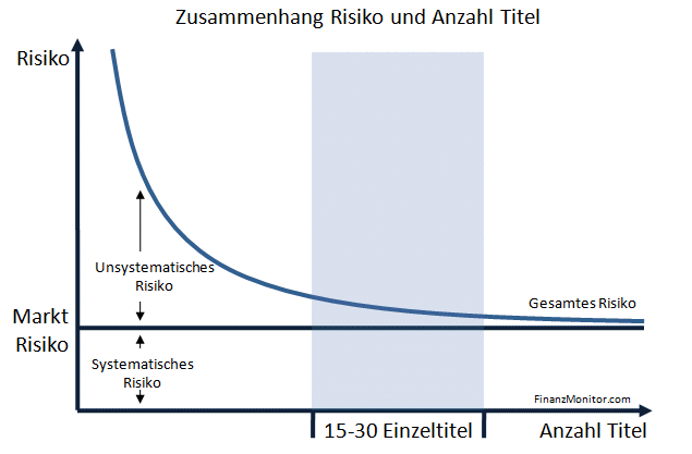 Unternehmensspezifische Risiken (unsystematisches Risiko) sind besonders präsent in Depots mit wenigen Einzeltiteln. Je mehr das Portfolio diversifiziert wird, desto insignifikanter wird das Risiko eines einzelnen Titels. Nach wissenschaftlichen Untersuchungen soll ein optimal diversifiziertes Portfolio 15-30 Einzelwerte enthalten, um unternehmensspezifische Risiken weitestgehend zu eliminieren. Dies ist beispielsweise bei den meisten Fonds der Fall, auf die wir detailliert in einem separaten Artikel eingehen.