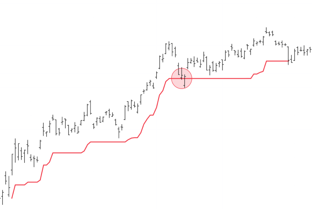 Die Annahme ist, dass sich ein intakter Aufwärtstrend durch höhere Tiefs kennzeichnet. Sollte das letzte Tief durchbrochen werden, rechnen technische Analysten mit einer Umkehr in den Abwärtstrend. Um sich vor einer mittel- bis langfristigen Abwärtsbewegung zu schützen, wird der Stop entsprechend unterhalb des Tiefs platziert.