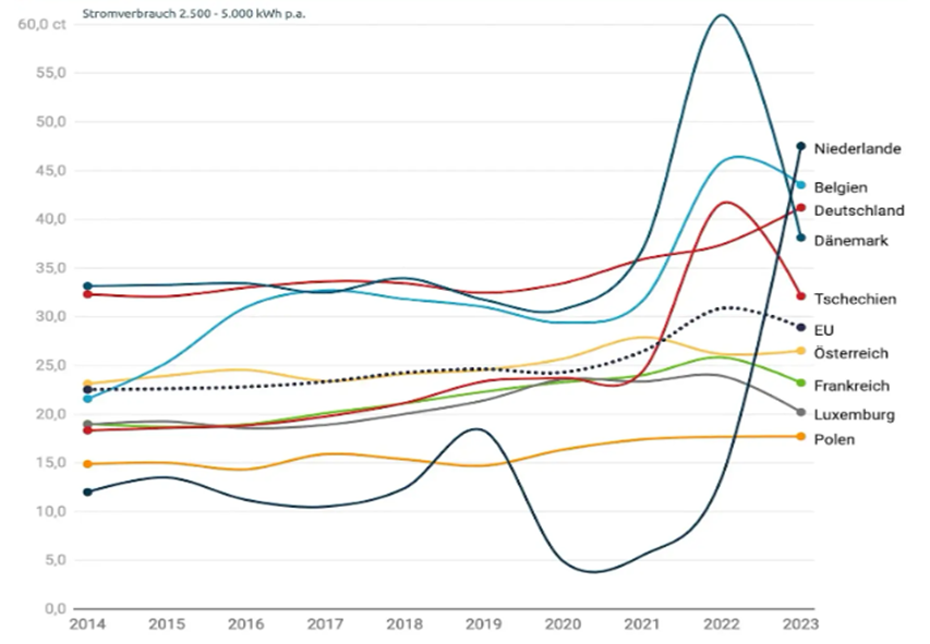 Strompreisentwicklung Europa im 10-Jahres-Vergleich