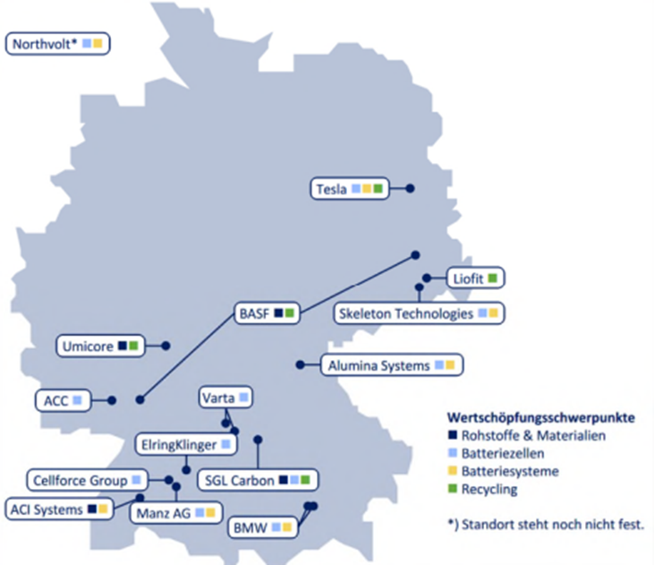 Die Produktion von Lithium-Ionen-Batterien ist eine der zentralen Technologien für die Elektromobilität und auch für die Energiespeicherung erneuerbarer Energien. Deutschland ist traditionell in der Forschung zur Batterietechnologie stark und hat große Schritte unternommen, um in die eigene Batteriezellproduktion zu investieren. Derzeit betreibt das chinesische Unternehmen CATL bei Erfurt die größte Produktion (8 GWh/Jahr). Tesla und VW bauen Werke in Brandenburg (50 GWh/Jahr) und Salzgitter (40 GWh/Jahr). Andere Produzenten haben Kapazitäten von insgesamt 130 GWh/Jahr. In Deutschland werden jährlich etwa 4 Mio. Autos produziert. Mit den beiden in Bau befindlichen Werken könnten bereits etwa eine Million Autos mit Batterien versorgt werden.